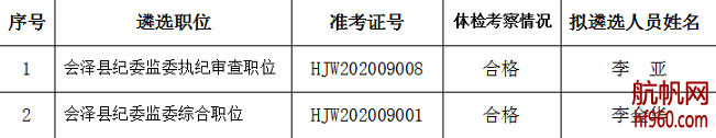 根据《中共会泽县委办公室 会泽县人民政府办公室关于转发〈曲靖市市直机关公开遴选公务员实施办法(试行)〉的通知》(会办通〔2017〕63号)要求,按照《中共会泽县纪委会泽县监委2020年公开遴选公务员公告》的时序安排,会泽县纪委监委2020年公开遴选公务员报名、资格初审、笔试、资格复审、面试、经历业绩评价、体检和考察各项工作已全面完成,现将体检、考察等相关情况及拟遴选人员进行公示。