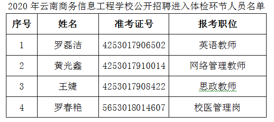按照《云南商务信息工程学校2020年事业单位公开招聘工作人员公告》招聘程序,经笔试、资格复审、面试后,根据综合成绩排名情况,按招聘人数与体检人数1:1的比例确定参加体检人员共4人。现将进入体检环节的人员名单及后续工作公告如下:
