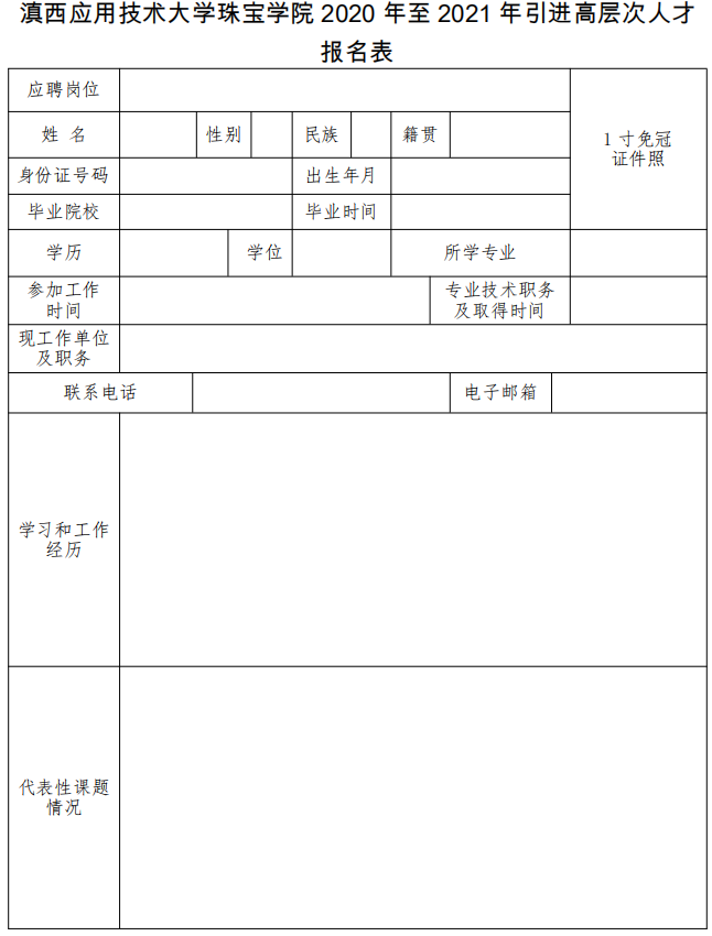 1.报名方式:报名采取网络报名的方式进行,应聘人员需填写《滇西应用技术大学珠宝学院2020至2021年引进高层次人才报名表》(附件),连同身份证、学历学位证(留学回国人员须提供教育部认证的材料)、职称证或职业(执业)资格证、代表性学术成果等发送至学院人事处邮箱(邮箱地址:zbxyrc5159339@163.com)进行报名(邮件主题统一命名为姓名+应聘岗位名称)。