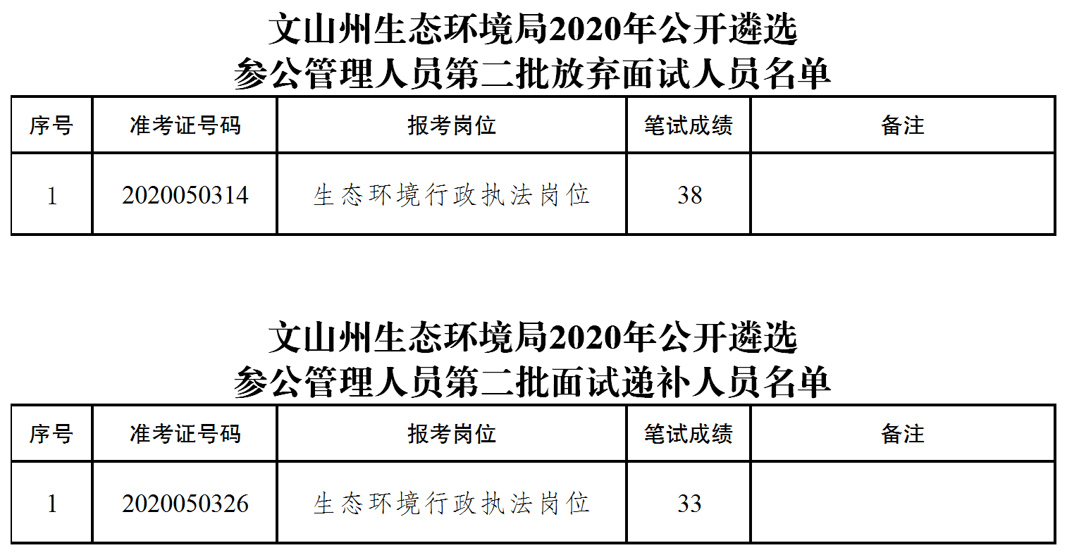文山州生态环境局2020年公开遴选参公管理人员第一批面试递补人员面试资格确认完毕,现有1名考生自愿放弃面试资格,根据《文山州生态环境局2020年公开遴选参公管理人员公告》《文山州生态环境局2020年公开遴选参公管理人员面试公告》及公开遴选有关规定,自动放弃面试资格,将顺延递补下一名考生。现将第二批放弃面试人员及递补人员名单公告如下: