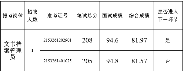 中共文山州委统战部2021年公开招聘文山州统战事务中心工作人员面试已于2021年7月25日下午结束,现将笔试和面试综合成绩公布如下。请进入下一环节人员携带笔试准考证、身份证于2021年7月28日上午7:40到文山州人民医院体检中心参加体检。;