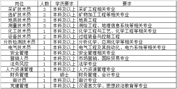 专业技术管理人才结构:采矿、矿物加工、资源勘查、测量、机械工程及其自动化、过程装备与控制、电气、仪表、自动化、企业管理、会计或财务管理、市场营销、法律……等。