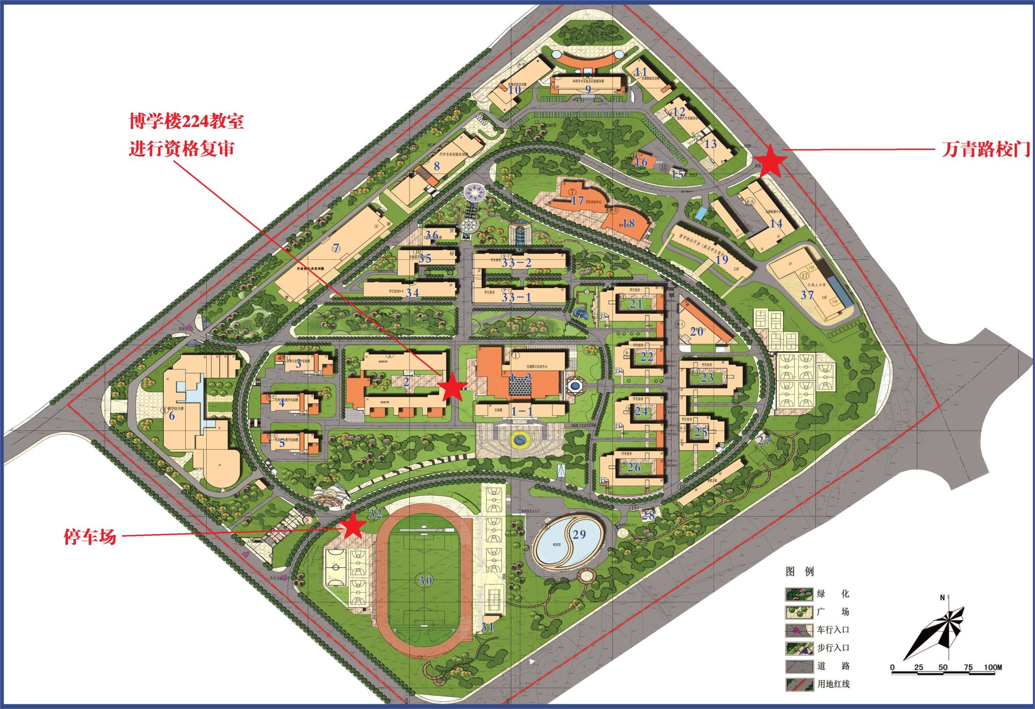 因学校停车位十分紧张,参加资格复审的考生请尽量乘坐公共交通,从万青路校门入校。确实需要开车入校的,请听从学校安保人员指挥,登记车牌及联系方式,在指定地点内停车,停车地点及资格复审地点见图示: