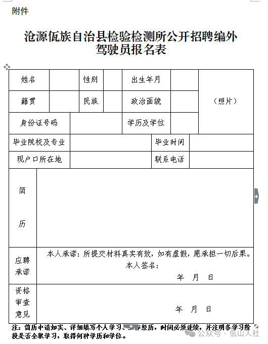 附件:沧源佤族自治县检验检测所公开招聘编外驾驶员报名表