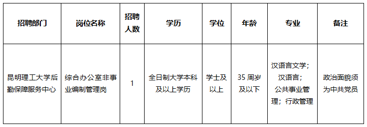 昆明理工大学后勤保障服务中心因工作需要,现面向社会公开招聘非事业编制管理岗位工作人员1名,现将有关招聘事宜公告如下: