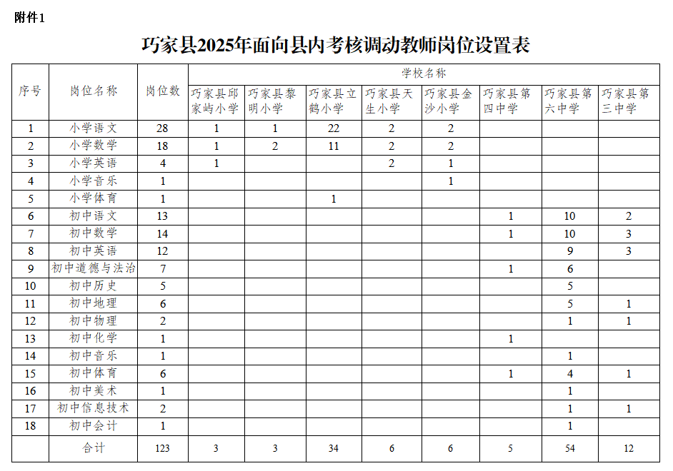 本次计划考核调动县内教师123名、县外教师54名,共计177名。具体岗位设置详见《巧家县2025年面向县内考核调动教师岗位设置表》(附件1)、《巧家县2025年面向县外考核调动教师岗位设置表》(附件2)。