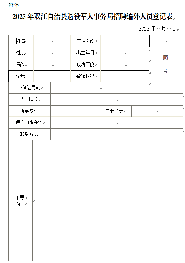 3.报名时需提供本人户口册、身份证原件及复印件,近期免冠一寸彩色证件照1张及照片电子版,学历证书原件及复印件,《2025年双江自治县退役军人事务局招聘编外人员登记表》。填报虚假信息或提供虚假材料的,一经查实,取消报名资格及后续环节,被招聘的取消聘用。