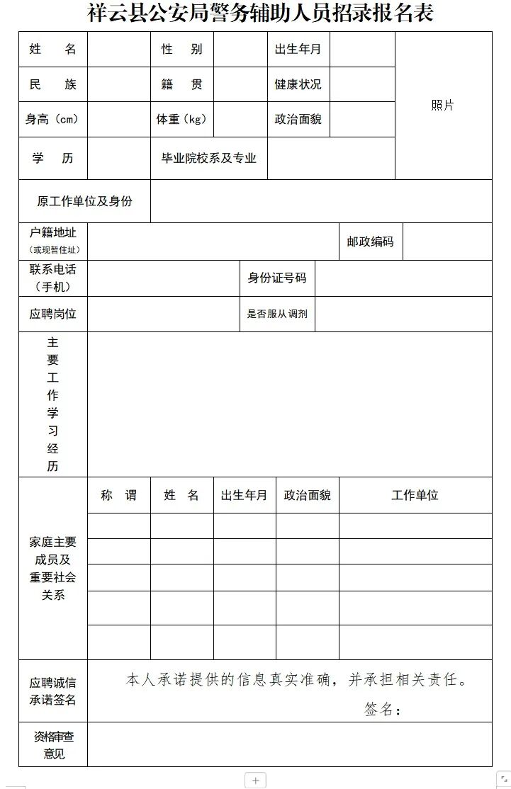4.报名材料:(1)《祥云县公安局警务辅助人员招录报名表》1份(附照片);