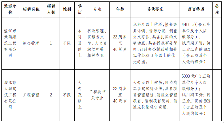 澄江市天颐建筑工程有限公司公开招聘项目用工人员招聘公告
