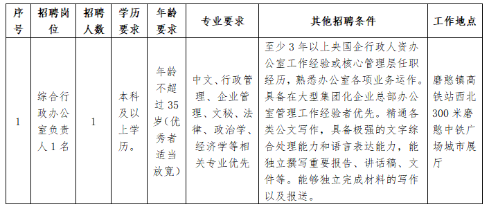 此次面向社会公开招聘综合行政办公室负责人1名,采取劳务派遣方式与我公司签订劳动合同,派遣至云南磨憨站城城市开发有限公司工作。