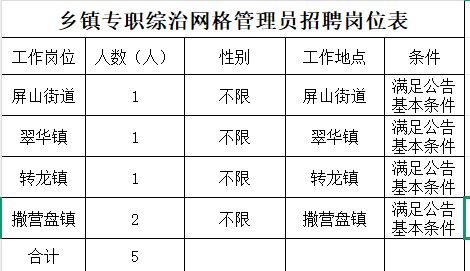 本次招聘为劳务派遣用工性质,共招聘5人,实行劳动合同制管理,岗位为乡镇专职综治网格管理员,不纳入编制管理,主要负责矛盾纠纷排查化解、特殊群体服务管理等网格化服务管理工作。具体招聘岗位需求见文段末附件1《乡镇专职综治网格管理员招聘岗位表》。