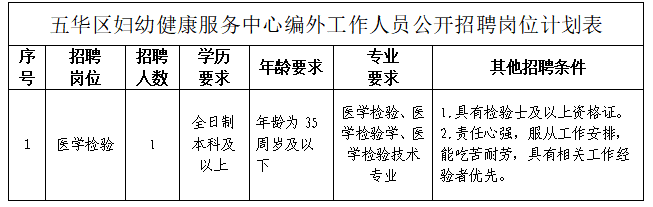 为进一步满足五华区妇幼健康服务中心工作开展需要,按照公开、平等、竞争、择优的原则,委托云南润邦人力资源服务有限公司(以下简称公司),面向社会公开招聘1名医学检验工作人员,现将招聘有关事项公告如下: