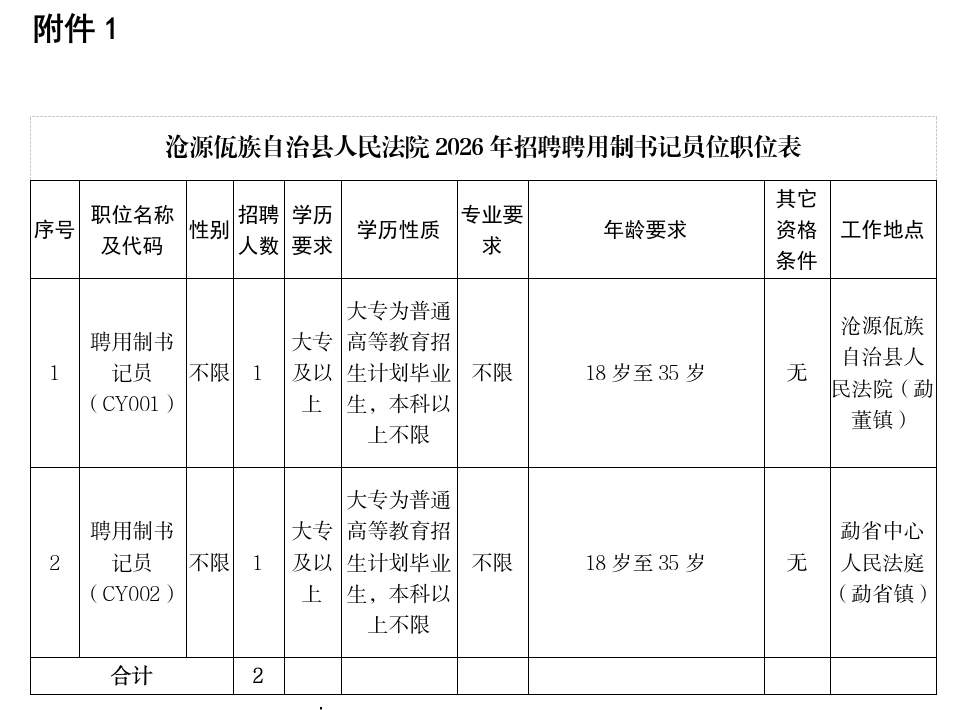 结合实际制定具体的招聘条件,具体要求详见《沧源佤族自治县人民法院2026年招聘聘用制书记员设置表》。取得学历学位的截止时间为2026年6月30日。