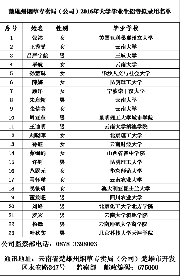 云南省烟草公司楚雄州公司2016年招考拟录用人员名单