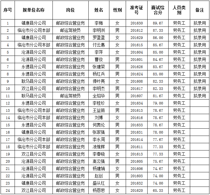 临沧市邮政分公司2016年劳务工招聘拟录用情况公示