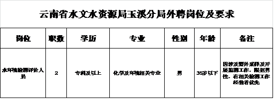 根据玉溪水文事业发展需要,我单位面向社会公开招聘2名编制外工作人员,具体岗位和要求如下: