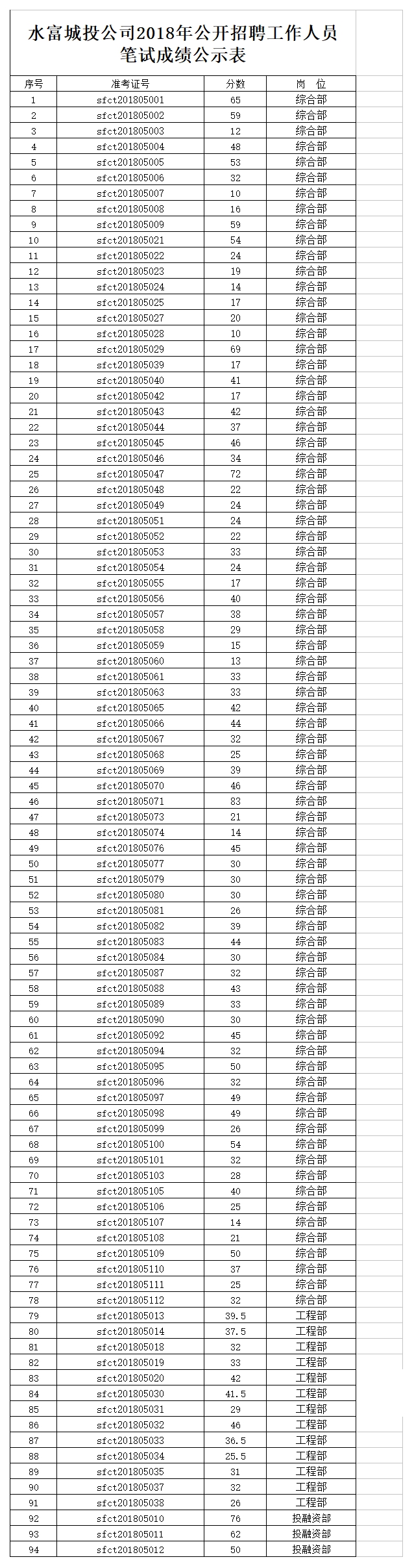 昭通市水富城投公司2018年招聘工作人员笔试成绩公示