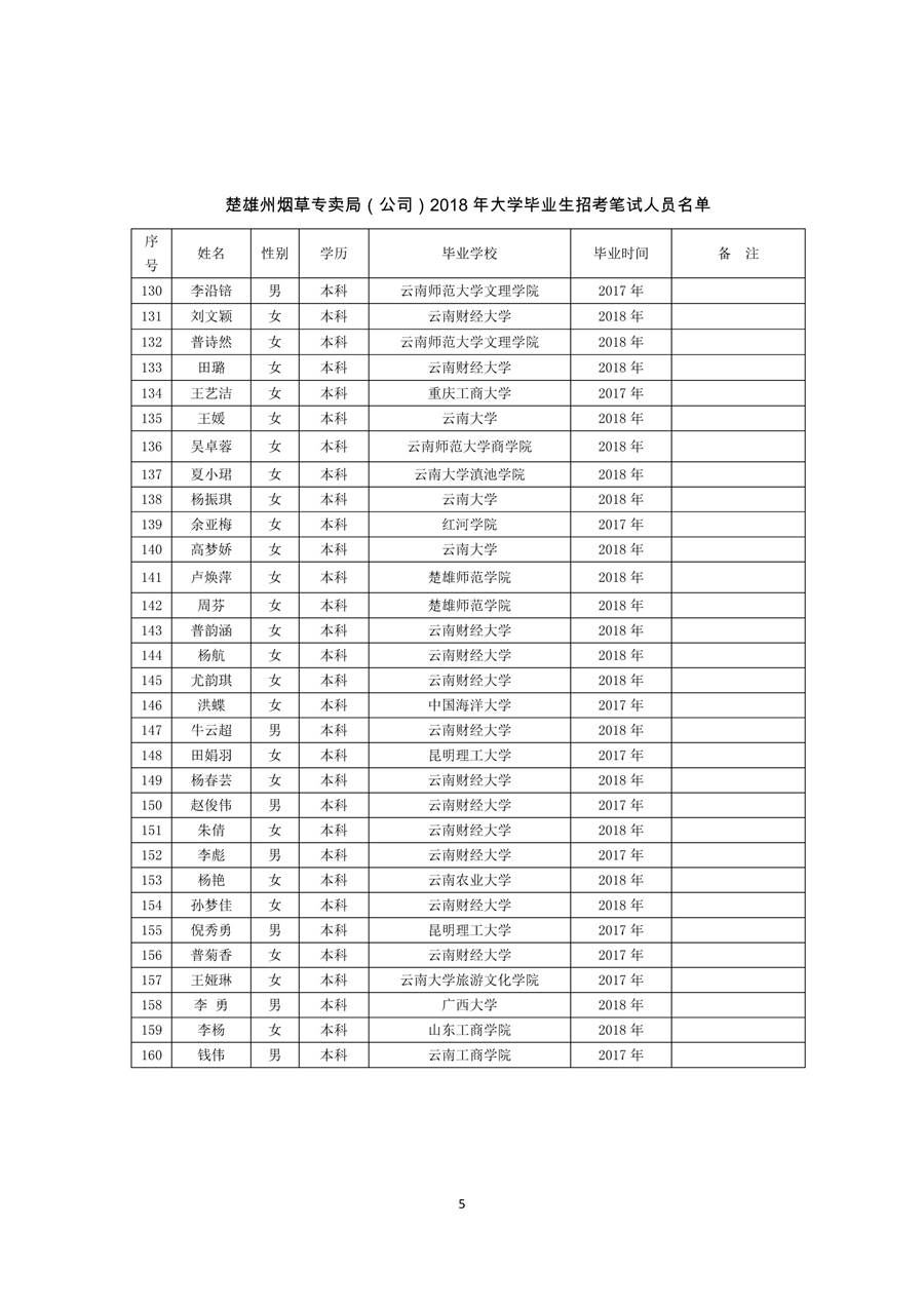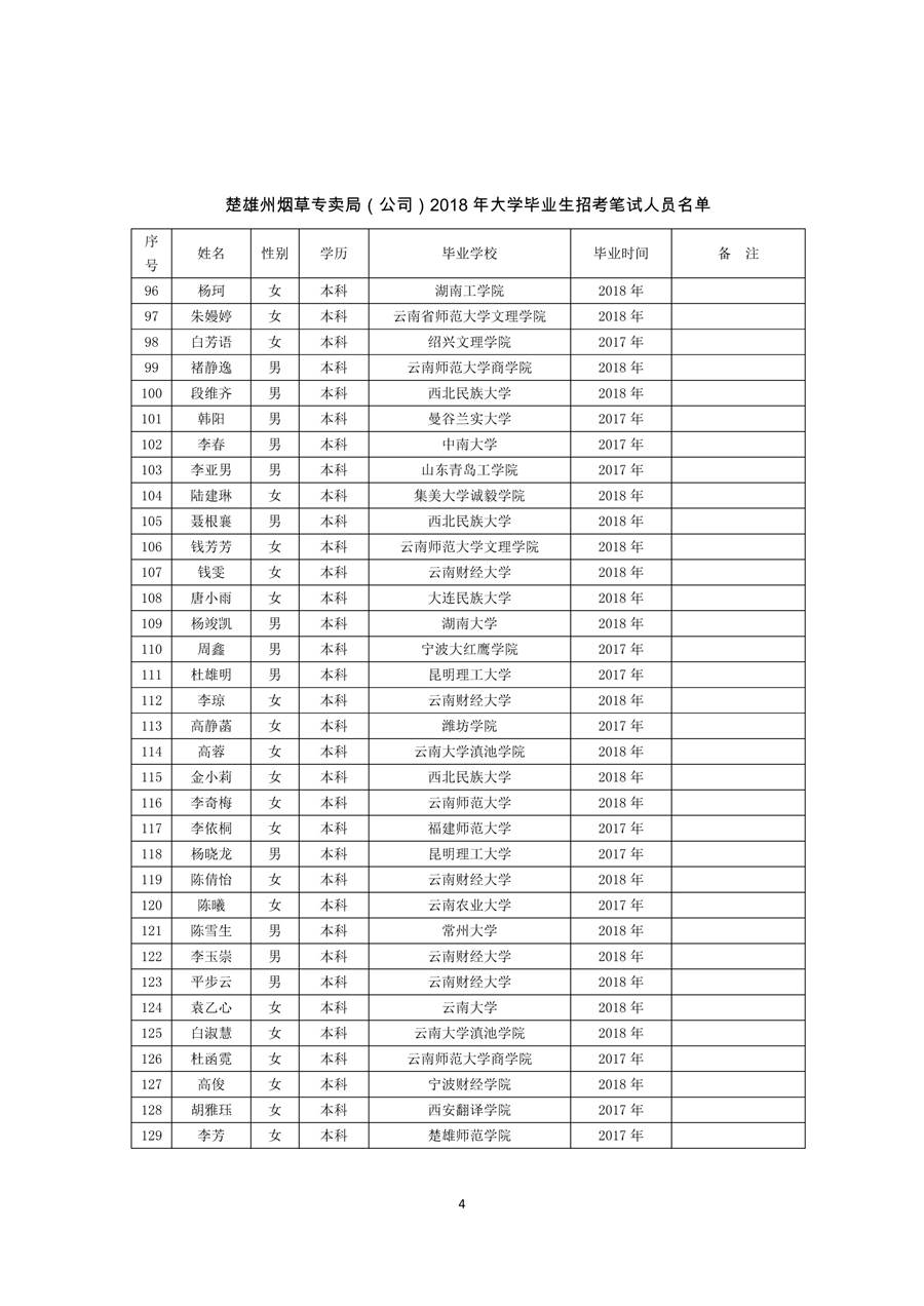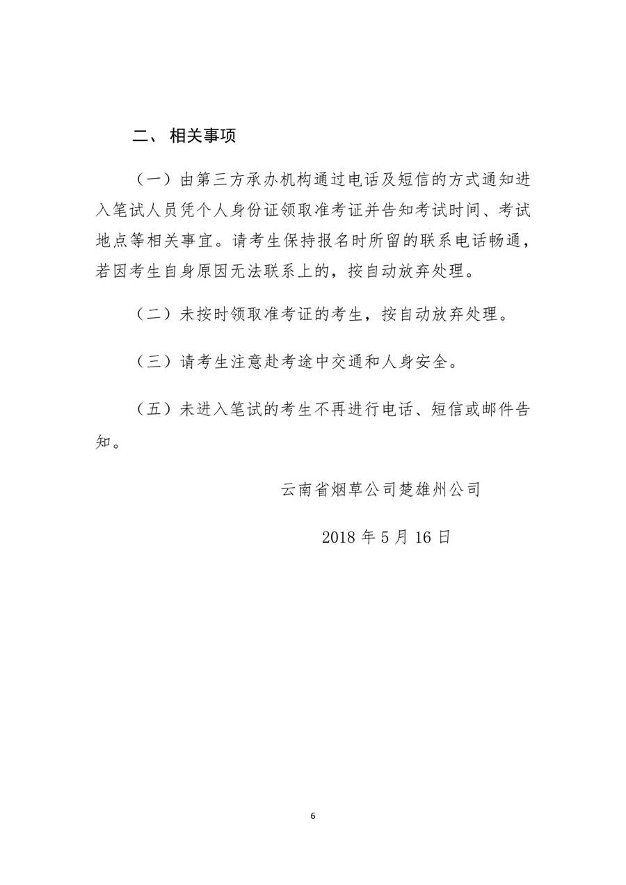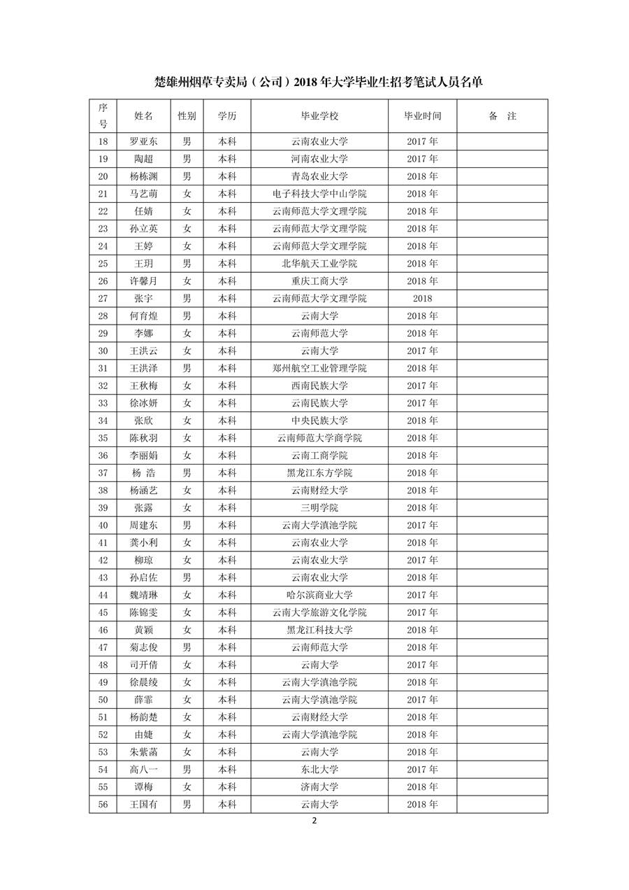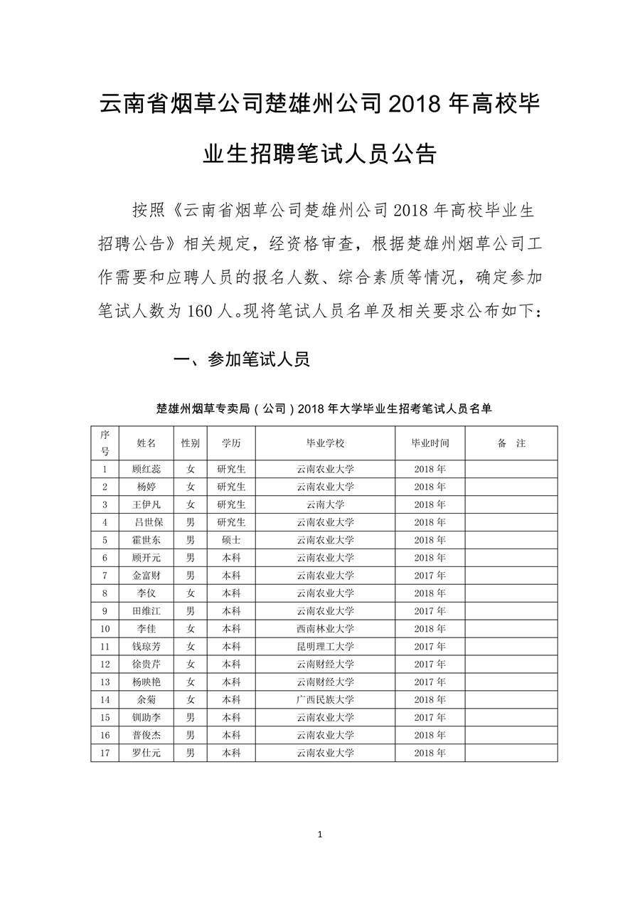 云南省烟草公司楚雄州公司2018年高校毕业生招聘笔试人员公告