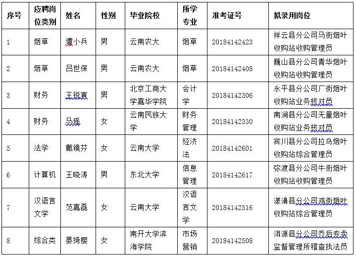 根据《云南省烟草专卖局人事处关于下达2018年毕业生招录计划的通知》(大烟专[2018]13号)下达我公司2018年招录大学毕业生名额,我公司委托第三方组织实施了招聘,报名、资格审核、笔试、面试、体检等流程已全部完成。现对拟录用人员名单公示如下: