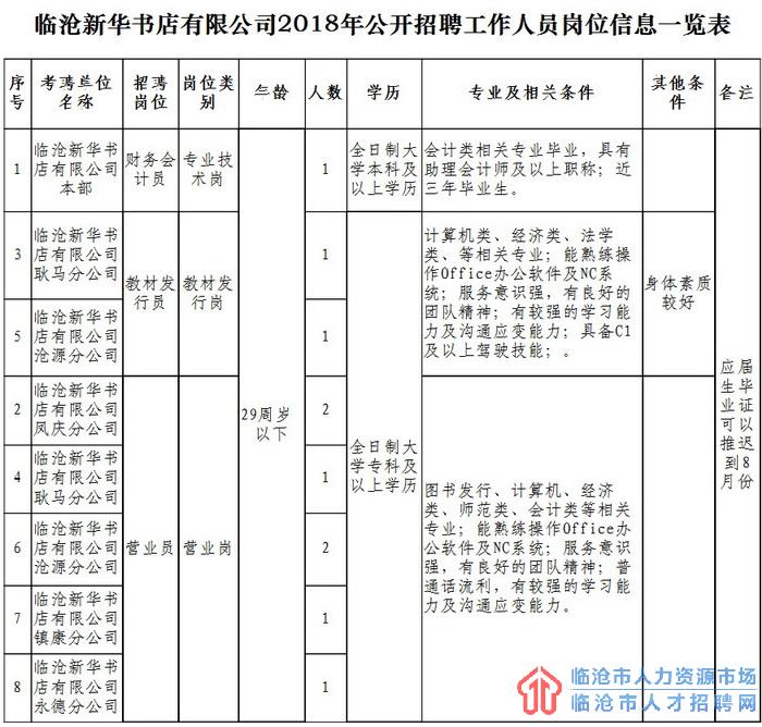 1.临沧新华书店有限公司2018年公开招聘工作人员岗位信息一览表