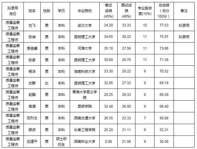 根据工作需要,综合笔面试成绩及排名,现对拟录用人员进行公示。如对拟录用人员有异议,请及时向昆明轨道交通集团有限公司纪检监察室反映。