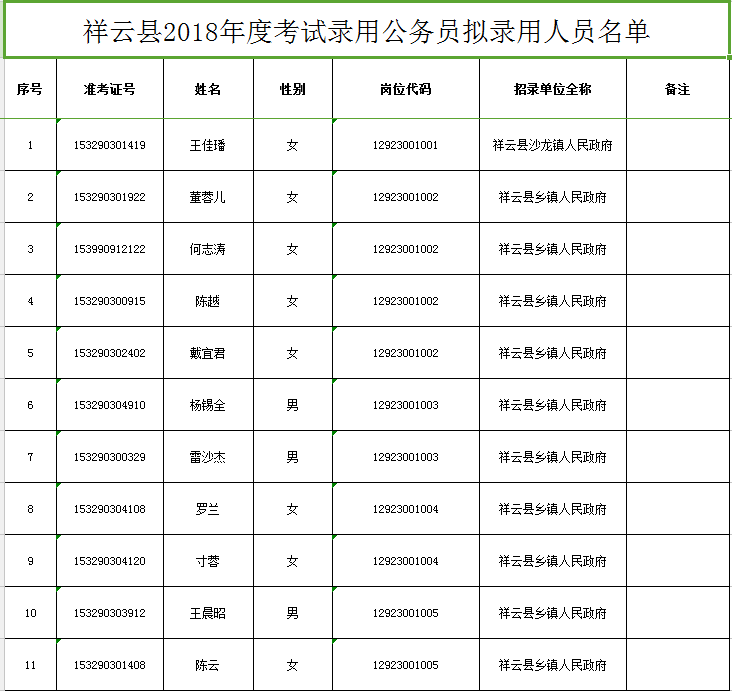 附件:祥云县2018年度考试录用公务员拟录用人员名单