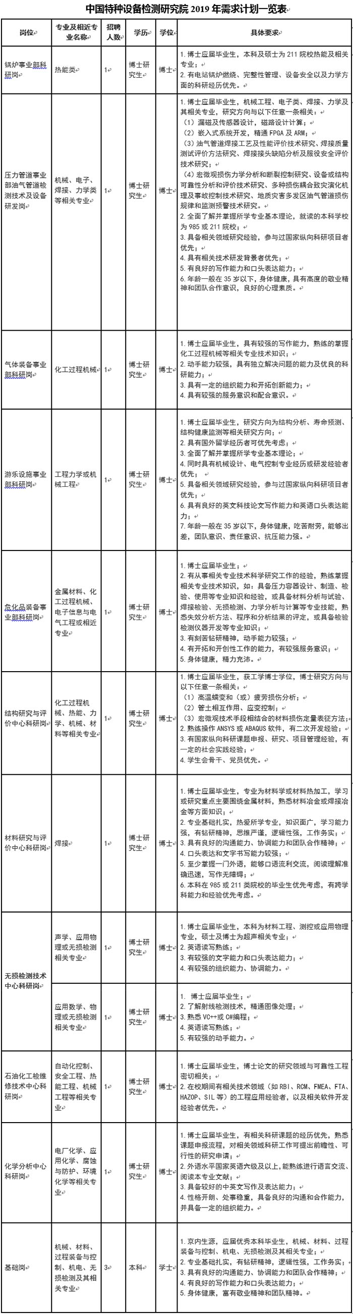 中国特种设备检测研究院2019年招聘简章