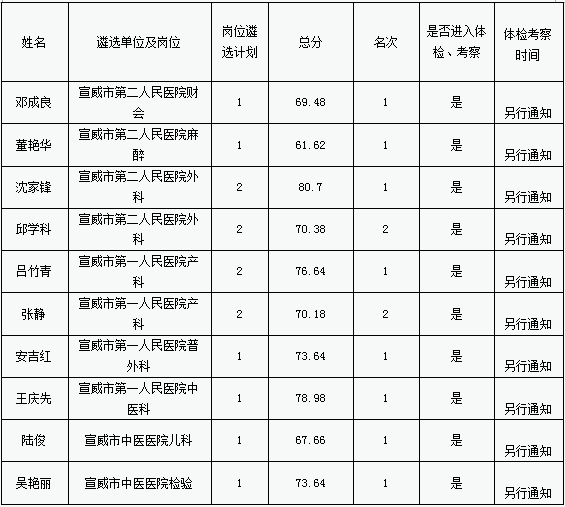 根据《中共宣威市委办公室、宣威市人民政府办公室关于印发〈宣威市市属事业单位公开遴选工作人员实施办法(试行)〉的通知》(宣办发〔2017〕115号)规定,按照《宣威市卫生和计划生育局所属事业单位2018年公开遴选工作人员实施方案》的程序安排,遴选工作的笔试、经历业绩评价、面试工作已全部结束,进入面试考生的总成绩已于2018年12月11日在宣威市人民政府门户网站进行公告,现将宣威市卫生和计划生育局所属事业单位2018年公开遴选工作人员拟进入体检、考察人员进行公示。