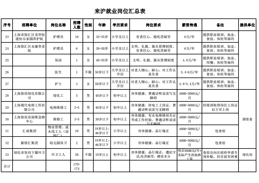 | 20 | 上海徐诚家庭(政)服务部 | 家政服务,日用品、文教用品销售。 | 保安员 | 20 | 18-45 | 初中以上 | 要求:主要为客户单位提供门卫、巡逻、守护、随身护卫、秩序维护、安全检查等,站立时间较多,上下班可能需乘坐公交或地铁,需能适应。主要是招男性,18-35周岁,个别项目年龄可放宽到45周岁,要求身高1.70m-1.86m;五官端正,无精神、传染及慢性疾病,无纹身、刺青、秃顶及斜视,无违法犯罪等不良记录;手指无残缺,面部无大的疤痕或肉瘤等;中共党员、退伍军人优先;责任心强,服从公司管理,有较强的安全意识。 | 4500~7000元(具体根据单位和项目的实际情况决定,包含加班费) | 部分提供食宿,部分只提供住宿(具体根据项目实际情况决定) | ||