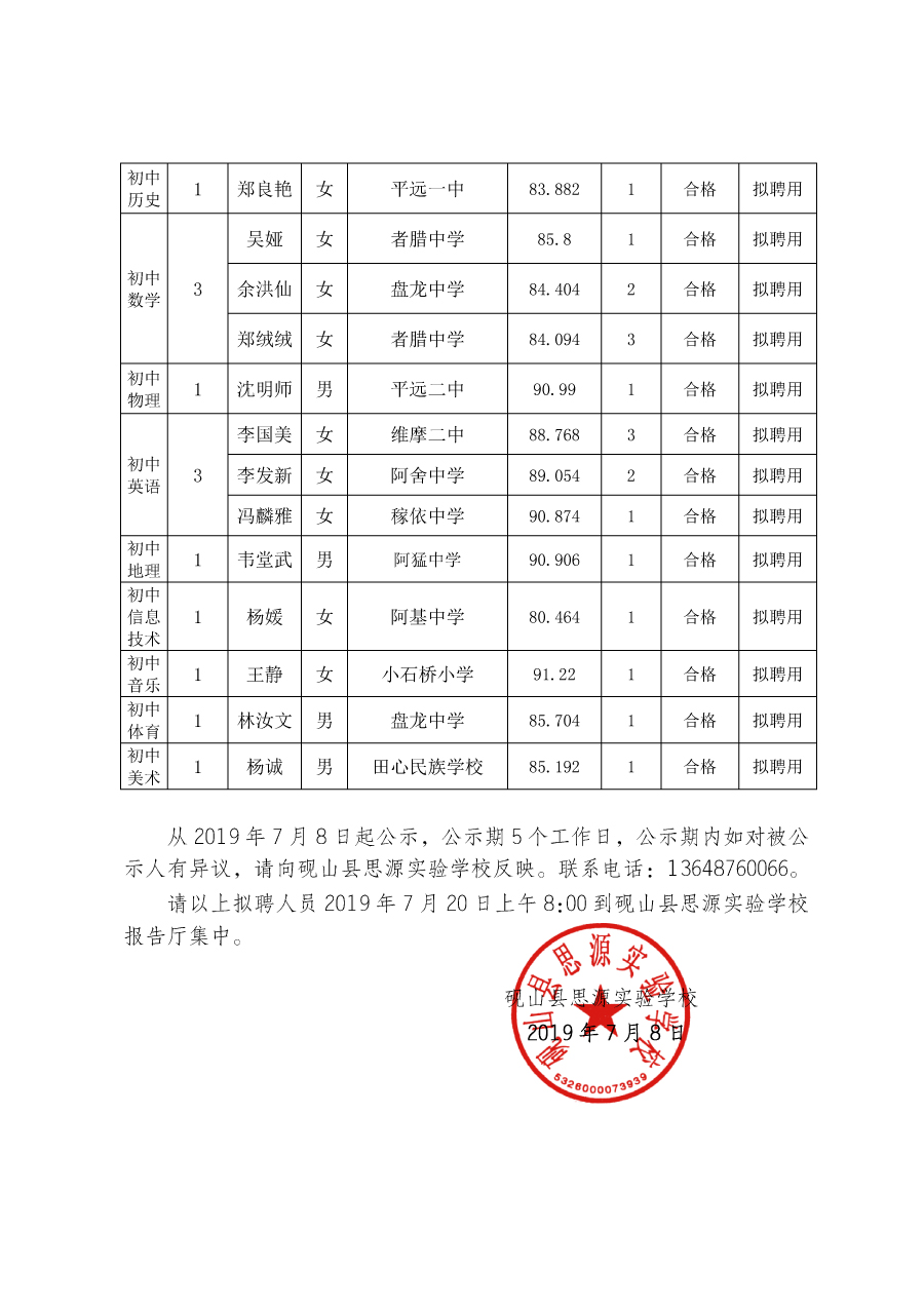 砚山县思源实验学校2019年面向县内公开选调小学、初中教师拟聘人员公告
