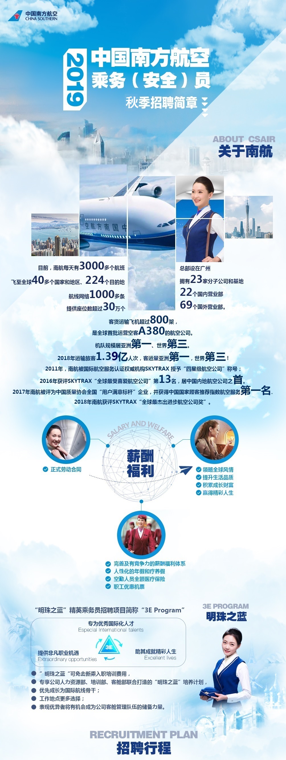 中国南方航空2019年乘务(安全)员秋季招聘计划(昆明站)
