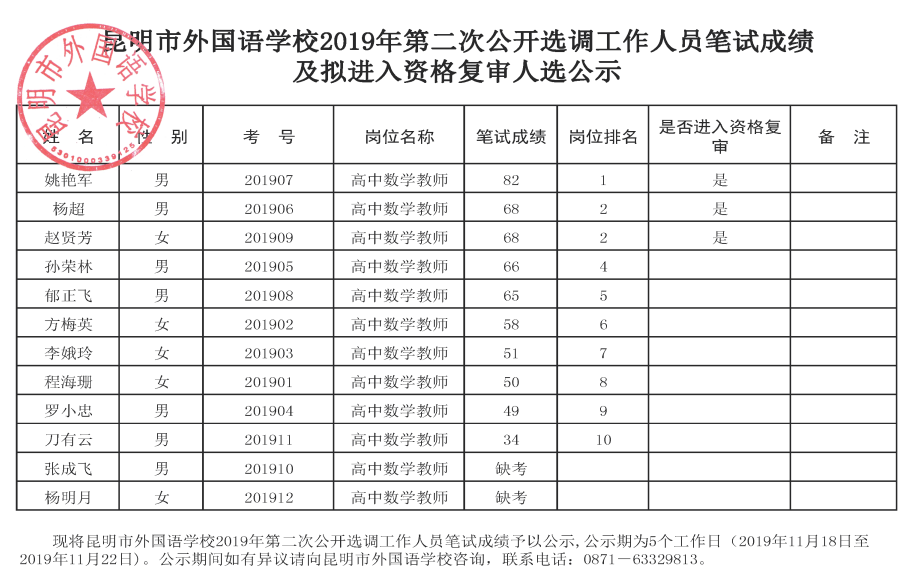 昆明市外国语学校2019年第二次公开选调工作人员笔试成绩及拟进入资格复审人选公示