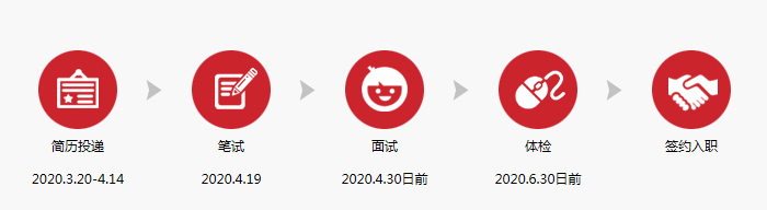 2020年3月20开始网申报名,4月14日晚12:00报名截止(每人只能填报一个职位,投递成功后,如想变更简历内容或撤销本次申请,可于4月14日前,在招聘官网右上角【个人中心】进行简历编辑或申请撤销,4月15日后不可以调整)。如通过简历初筛,我们将在4月15日之后给您发送笔试邀约邮件和短信,请各位同学按照邀约邮件要求参加笔试。
