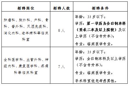 根据医院业务发展需求,我院肿瘤科、胸外科、产科等临床科室需招聘临床医师15名,具体招聘岗位及条件如下:
