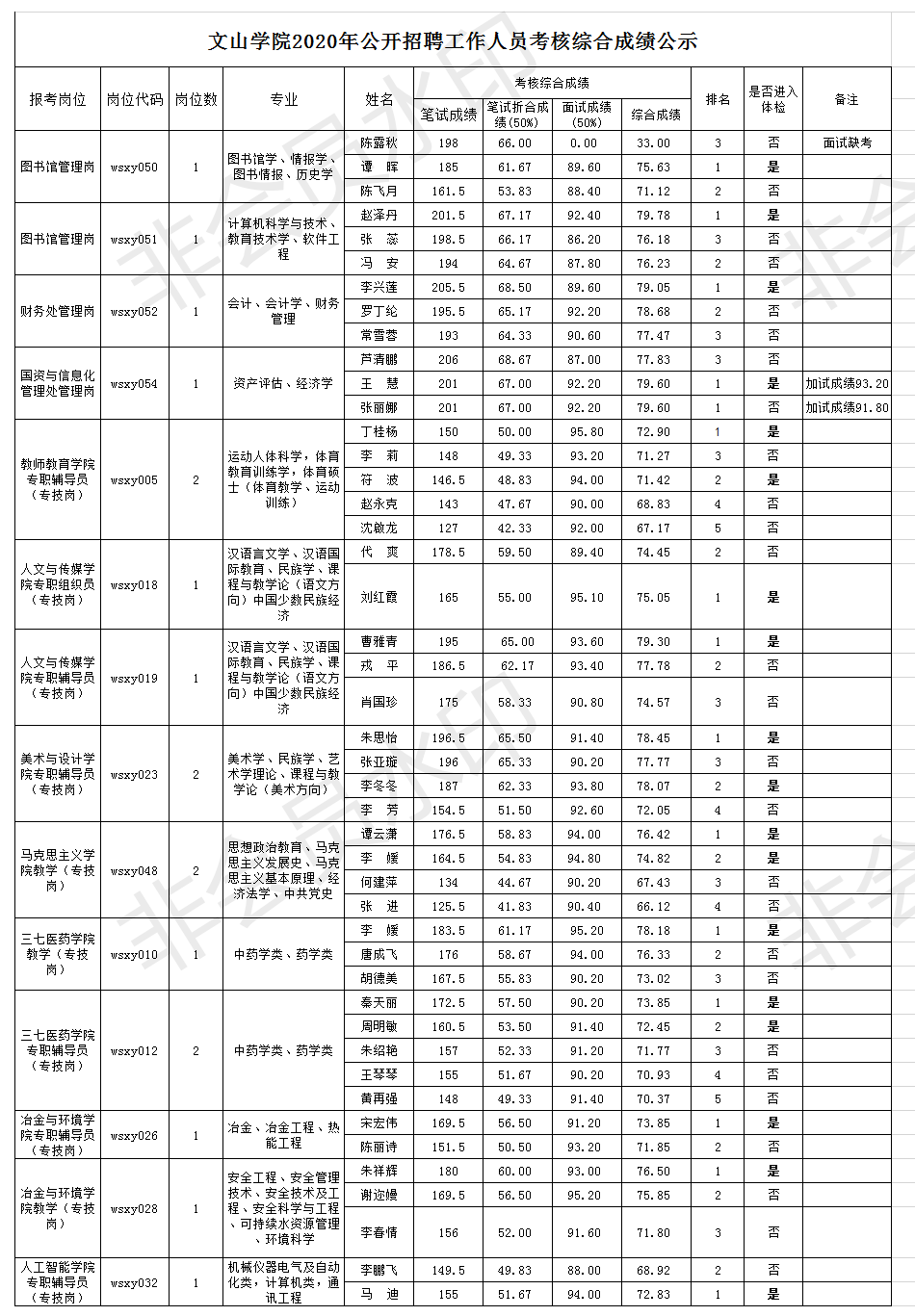 文山学院2020年公开招聘工作人员考核综合成绩公示