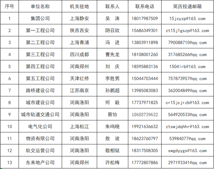 需求专业:土木类、测绘类、无机材料类、机械类、工程管理类、工程造价类、铁路四电、轨道运营类、安全管理类、经济管理类、财务类、法律类、中文类。