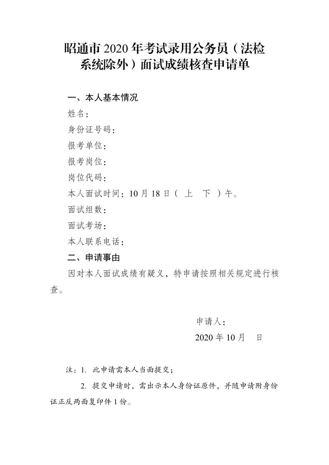 2.昭通市2020年考试录用公务员(法检系统除外)面试成绩核查申请单