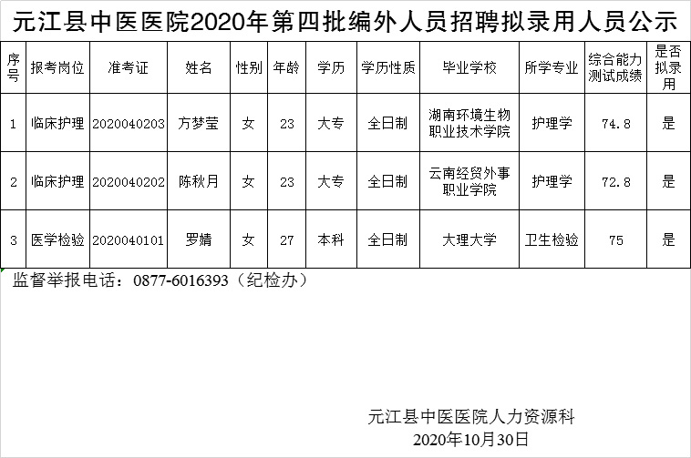 元江县中医医院2020年第四批编外人员招聘拟录用人员公示