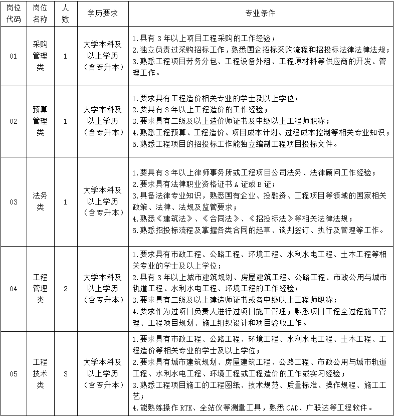 本次招聘面向社会公开招聘,招聘人数预计10人:采购管理类1人,预算管理类1人,法务类1人,工程管理类2人、工程技术类3人、财务类2人。