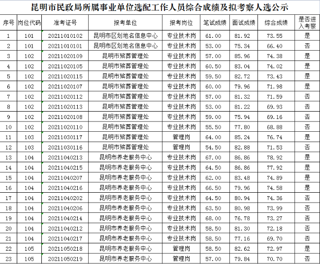 昆明市民政局所属事业单位选配工作人员综合成绩及拟考察人选公示