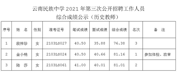 2021年云南民族中学第三次招聘工作人员综合成绩公示(历史)