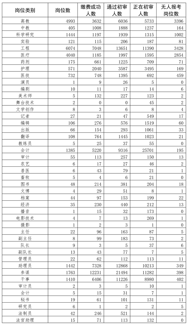 2022年全军面向社会公开招考文职人员(不含先面试后笔试岗位)网上报名火热进行中。截至12月7日17时,提交报名资格条件初审共251243人次,通过报名资格条件初审的报考人员94525人,缴费成功的报考人员52883人,用人单位正在进行报名资格条件初审的报考人员90033人。有人报考的岗位12250个、占47.99%,平均报招考比为7.7:1,最高报招考比为833:1。此次招考网上报名时间还剩2天,请广大报考人员抓紧时间申请报名资格条件初审,密切关注初审结果。因各城市考试席位有限,通过初审的报考人员请及时缴费和选择考试城市。相关招考岗位报考情况如下:
