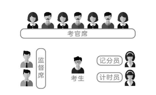 结构化面试考场一般会有5-9名考官,另外还有计时员、记分员、监督员。结构化面试的考场布置如下。