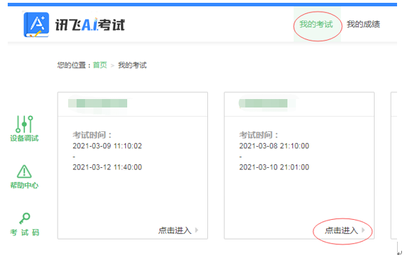 5.点击进入讯飞AI考试(在线)后,在“我的考试”页面中选择对应的考试。