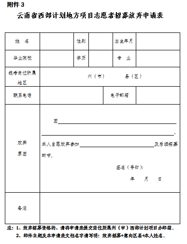 3.云南省西部计划地方项目志愿者招募放弃申请表(点击文末“阅读原文”,输入密码ooia下载)
