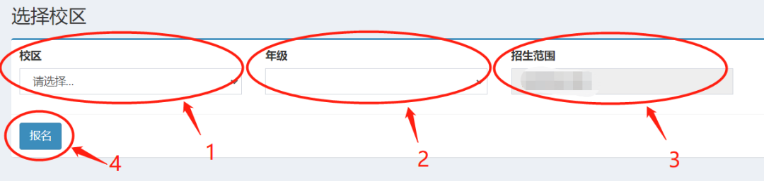 依次点击下拉框选择园区、年级、招生范围,确认无误后点击“报名”