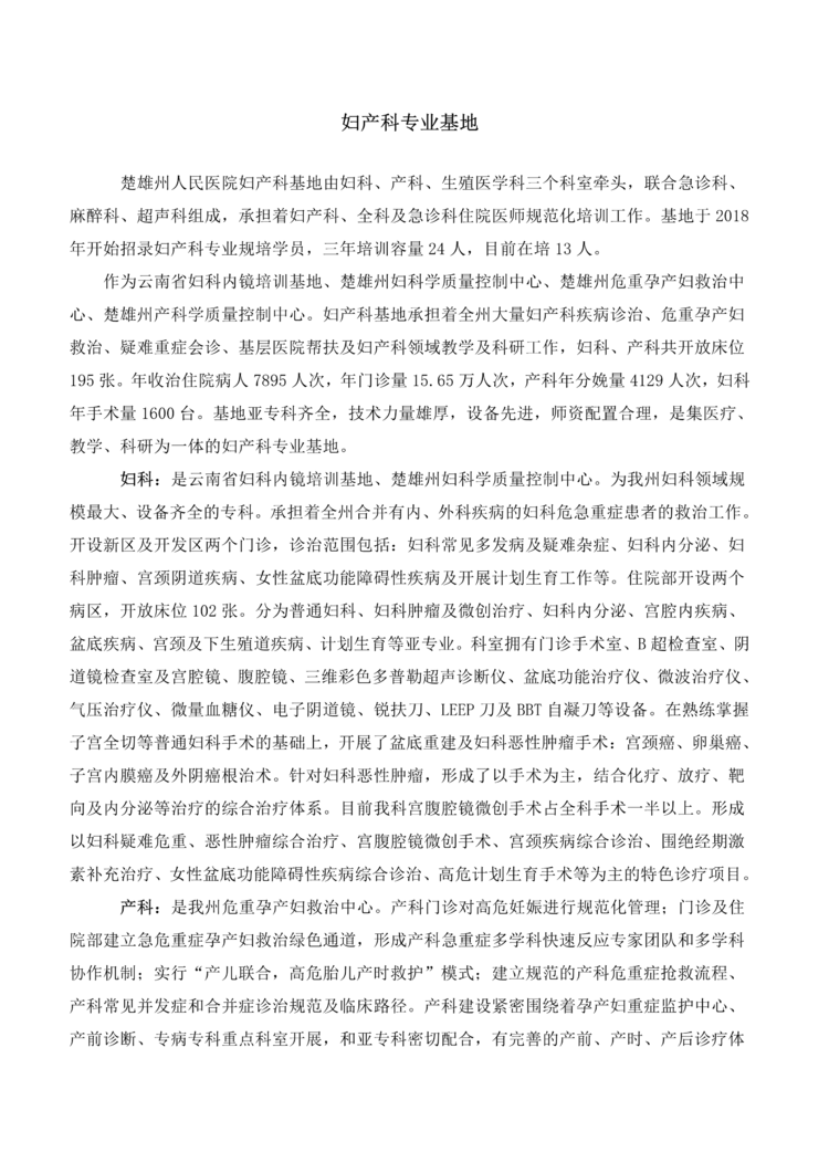 楚雄州人民医院占地25.4万平方米,开设临床科室72个、医技科室20个,开放床位2016张,年门诊量137万人次,年急诊量25万人次,年收治住院患者7.8万人次,年手术量3.2万人次,2017年成为国家级住院医师规范化培训基地,现有包括全科、内科、外科、急诊科、儿科等14个专业培训基地,充足的病种病例和先进的仪器设备为帮助住培学员从理论走向实践提供了坚实的保障。