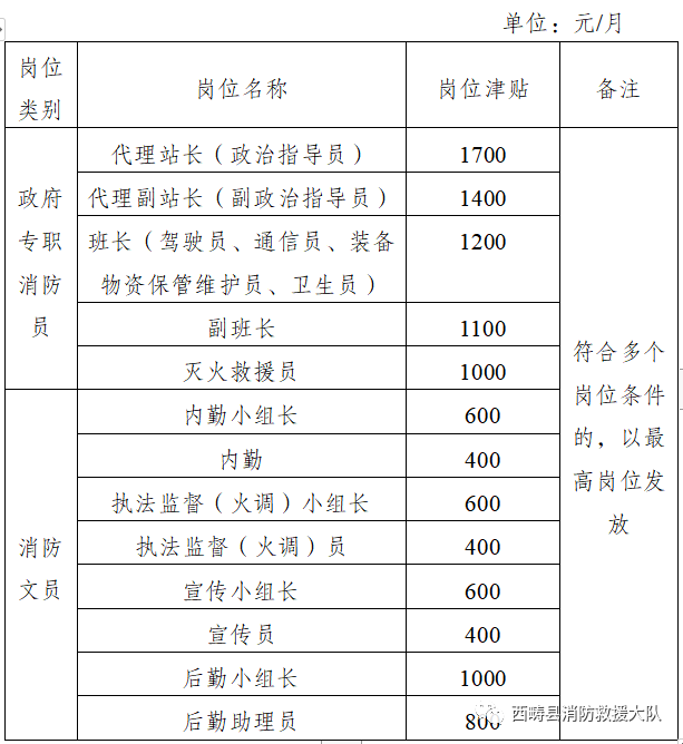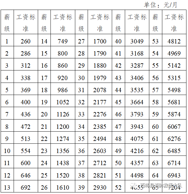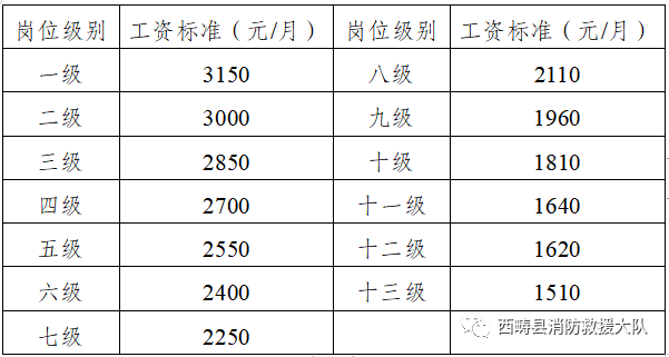 政府专职消防员岗位工资等级分为十三级,按照所定等级执行相应的岗位工资标准。新聘用的政府专职消防员岗位工资标准原则上高中(中专)执行十三级岗位工资标准,大学专科学历执行十二级岗位工资标准,大学本科学历执行十一级岗位工资标准,大学本科以上执行十级岗位工资标准。新聘用的特殊岗位人员岗位工资标准,原则上初级职称执行九级岗位工标准,中级职称执行七级岗位工资标准,高级职称执行五级岗位工资标准。