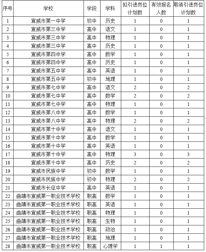 根据《中共曲靖市委曲靖市人民政府关于创新人才工作机制促进经济社会发展的意见》(曲发〔2014〕19号)、《曲靖市“珠源人才计划”教育人才专项实施细则》(曲党人才〔2021〕4号)、《关于<关于扩大“曲靖市珠源人才计划”教育人才专项引进对象范围的请示>的批复》和《云南省宣威市教育体育系统2022年教育专项人才引进公告》相关规定:“可根据报名情况调整引进岗位计划数。”“报名结束后,对达不到1:2报考比例的,递减或取消引进计划。”根据有效报名人数情况,现将调整、递减和取消部分岗位引进计划数公告如下: