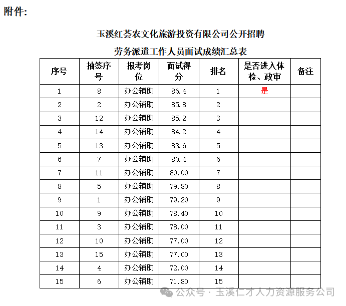 劳务派遣工作人员面试成绩公示